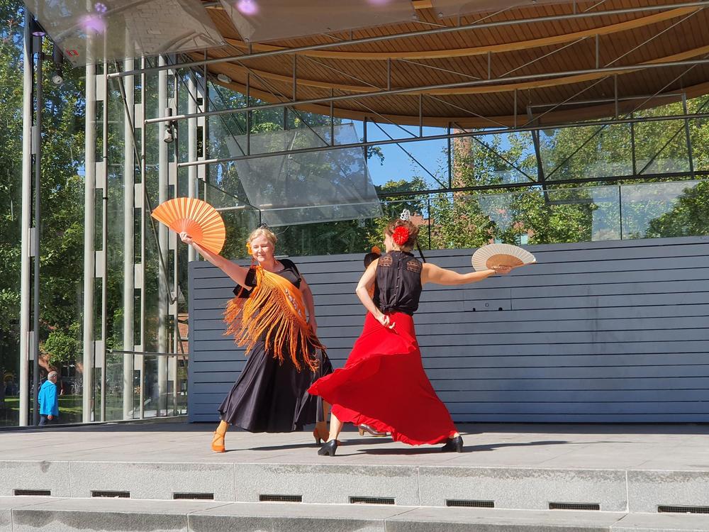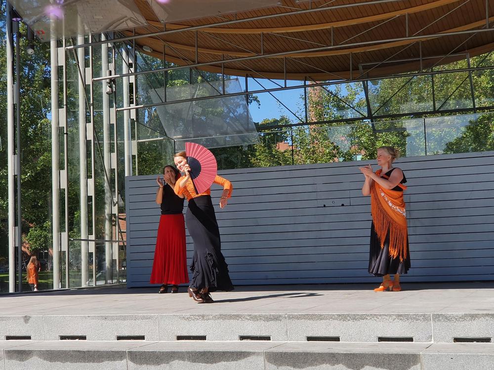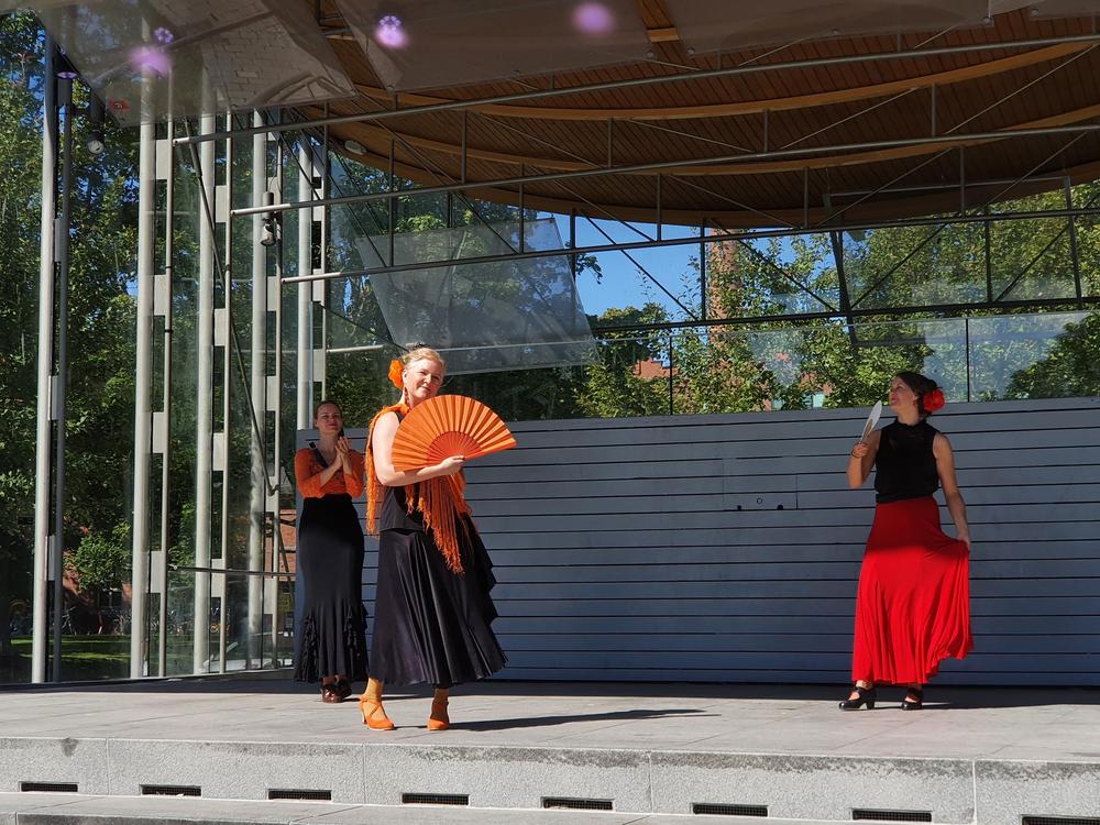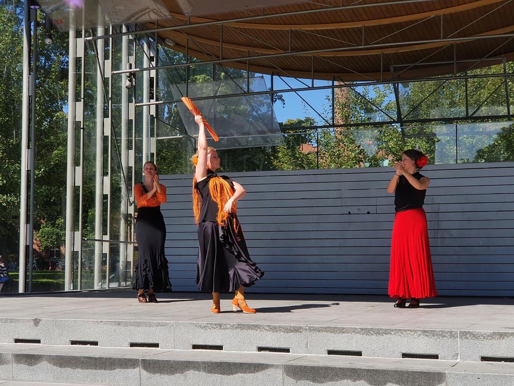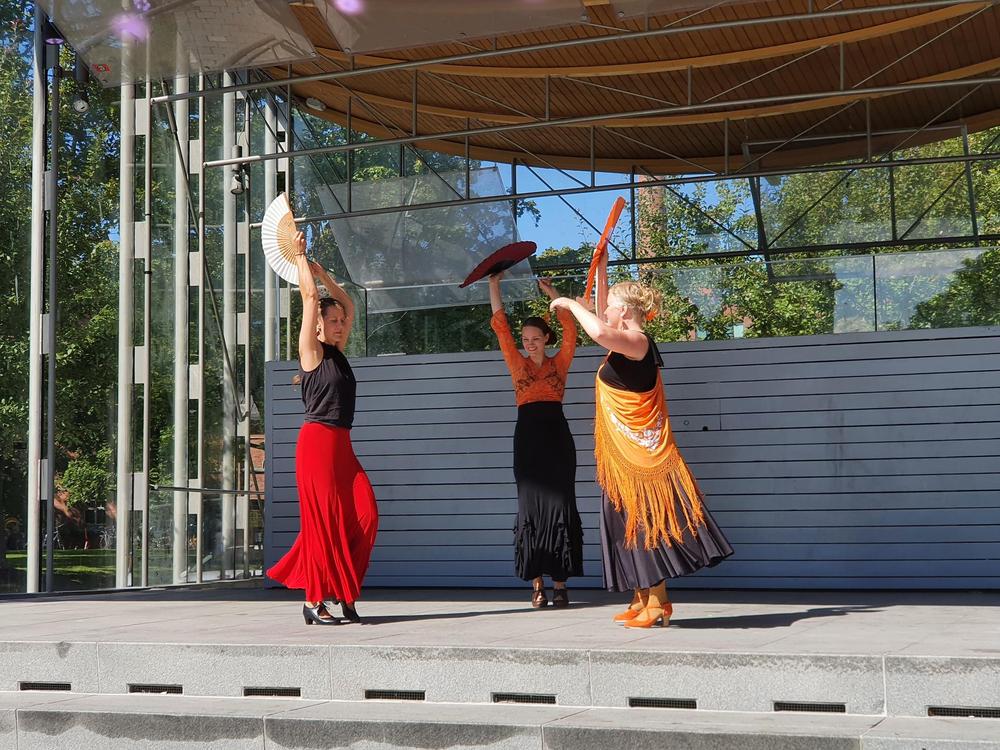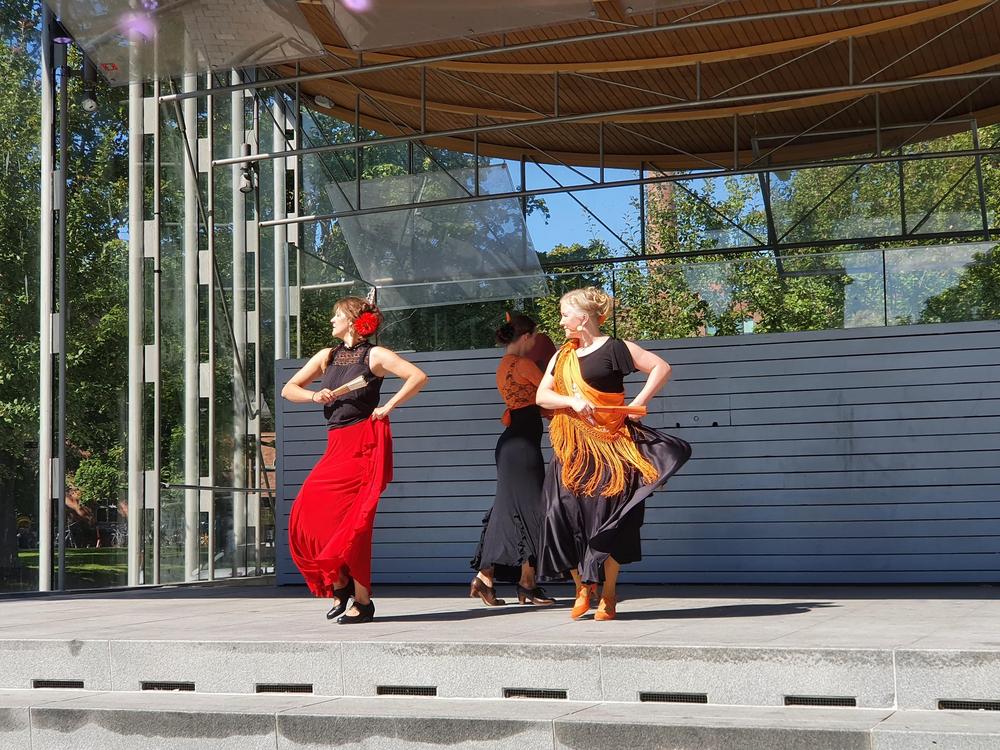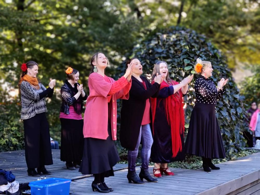 Flamencoyhdistyksen tanssiryhmä esiintyy Heinäpuistojuhlassa 26.9.2021. Kuva: Ilona Kyykoski